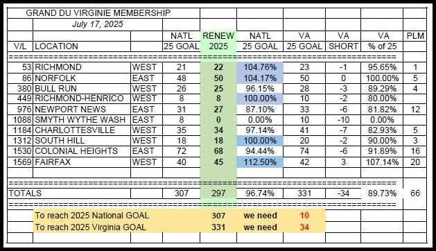 Here is the July 24, 2025 report. Reach out to all Voyageur Militaires that have not renewed for the year. We are well into the new membership year! Let’s try to improve our numbers! We are just 10 V/Ms short of 100%.