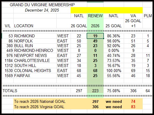 The 2026 Membership year is well underway. The Grande is at 75.08% and we are 13th overall with 64 VMs needed to reach 100%. Get your VM’s to renew!